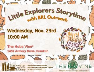 Join us at The Hubs Vine, in the City of Franklin, for fun storytimes with BRL’s Bookmobile/Outreach!